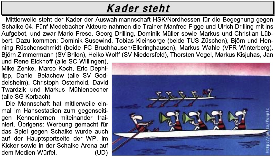 Am 28. April 2002 begrüßte uns der TuS Medebach zum 26. Spieltag der Kreisliga A Brilon. Wie mittlerweile üblich, gab der TuS auch damals zum Heimspiel das Sportecho heraus. Durch eine solide Saison waren wir bereits gerettet und konnten ohne Druck in den Süden fahren. So war anschließend auch das Ergebnis zu erklären… Für Henning und Björn wartete am Ende der Saison noch eine besondere Überraschung!
